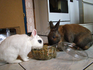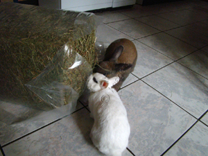 Sinds vanmiddag zijn ze niet meer uit elkaar geweest behalve als Snowy natuurlijk weer eens zijn beentjes strekt. Ik was een beetje bang dat hij net als vroeger zou afgeleid zijn en niet meer wilde eten. Gelukkig was mijn vrees onterecht, hij springt regelmatig in de wc of de kooi om hooi te eten en ook groenten gaan er vlotjes in. Hij eet vaker dan Fluffy. Ik probeerde de groenten in zijn kooi te geven maar dan komt Fluffy storen dus het wordt toch samen eten. Ik moet er gewoon op toezien dat hij voldoende eet en zich niets laat afsnoepen door Fluf. En ik moet oppassen dat hij zijn grenzen niet overschrijdt maar hem gedwongen laten rusten is héél moeilijk hoor. Nu hij de omgeving kent, huppelt hij wel stabieler.
