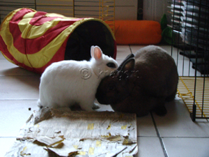 Anyway, ik ging vlug bij hen staan om te kunnen ingrijpen indien nodig. Ze leken elkaar in eerste instantie niet eens op te merken. Fluffy slenterde wat rond, Snowy was zich nog steeds aan het wassen. Toen hij in de gaten kreeg dat zijn vriendinnetje er was, stormde hij onstuimig en vol enthousiasme op haar af. Andere konijnen komen bedeesd kennismaken maar niet Snowy hoor. Net als alle andere dingen doet Snowy ook dit met zijn aangeboren felheid. Fluffy gromt en maakt een aanvalsbeweging maar daar blijft het bij. Ze gaat niet achter hem aan. Hij loopt weg, gaat ergens snuffelen en loopt haar opnieuw driftig tegemoet. Waarop hij dezelfde behandeling krijgt, heel even jaagt ze hem achterna door de tunnel maar dan geeft ze het weer op. Snowy is nog altijd véél sneller en dat beseft ze (en hij ook). Dan gaan ze weer door met andere activiteiten en negeren ze elkaar compleet. Na enkele minuten gaat Fluffy uit eigen beweging terug naar haar gedeelte door de opening die ze zelf gecreëerd heeft. Ik schuif het deurtje vlug dicht en zorg dat het d.m.v. een slotje niet meer open kan.
