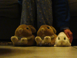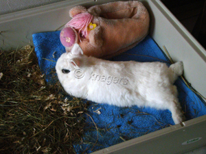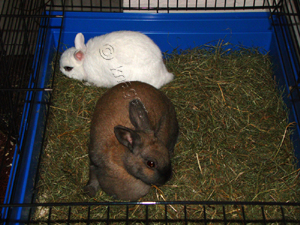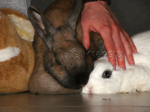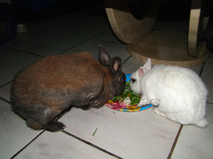 Vandaag was de laatste keer dat Snowy Panacur moest hebben. Hij zal alvast héél blij zijn dat hij van het vieze spul af is. Ik daarentegen zal erg alert op eventuele veranderingen. Toch heb ik er vertrouwen in dat hij sterk genoeg is om deze ziekte te verslaan, hoewel ik dit eigenlijk niet hardop durf te zeggen. Ik vind het zo heerlijk om hem weer bij me te hebben. Toen hij pas ziek was, miste ik zijn aanwezigheid verschrikkelijk. Hij was immers ontzettend nieuwsgierig en bij iedere handeling stond hij naast me. Daarom ben ik zo blij dat deze eigenschap weer helemaal terug is. Als ik de kast met voer opendoe, wroet hij zich onder mijn arm door. Als ik naar buiten ga, wriemelt hij zich tussen mijn voeten door. En als ik groenten maak, huppelt hij vrolijk rond mijn voeten. Nieuw is dat hij mij opzoekt als ik uit beeld verdwenen ben. Hij gaat altijd zo zitten of liggen dat hij mij in het oog kan houden. Inmiddels worden mijn konijntjes weer wat kleffer en zijn ze bijna altijd bij elkaar.