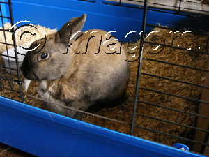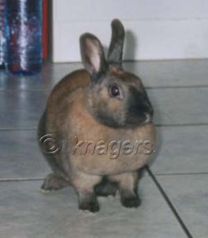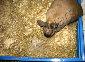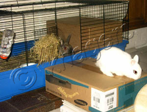 Fluffy kan dus overal in huis loslopen en op een morgen merkte ik dat ze de groentenmand geplunderd had, meer bepaald: ze had van alle aardappels wel een stukje gegeten. Die middag zat ze wat suf en stilletjes in een hoekje en achter haar ligt een bruin plasje. De geur wees duidelijk op stoelgang en geen urine dus ze had echt ernstige diarree. Natuurlijk naar de dierenarts waar ik antibiotica meekreeg. Omdat ik er niet dol op was om dat te geven, heb ik 1 dag afgewacht en de diarree was al vanzelf verdwenen. Ik had natuurlijk wel haar voeding aangepast maar dat bleek voldoende te zijn. En zodoende is nu ook de groentenmand "beveiligd" tegen konijnentandjes!