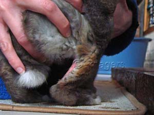 Hoe ze dit gekregen heeft weten we tot op de dag van vandaag nog niet. Er kunnen verschillende oorzaken zijn. Schimmel kan in voedsel of hooi zitten, wij kunnen het zelf door middel van onze kleren/schoenen hebben binnengebracht maar het meest waarschijnlijke lijkt mij: door de inenting tegen VHS en myxomatose. Er zijn nogal wat konijnen die daar een schimmelinfectie aan over houden. Fluffy dus ook, het begon met een plekje achter haar oren wat ze had opengekrabt en er was een korstje opgekomen. Later verspreidde het zich naar de nek en de aanzet van de oren, op die plaatsen werd ze ook kaal. De dierenarts gaf mij Surolan wat ik twee maal per dag moest smeren, daarna goed de handen wassen met Dettol om besmetting op mezelf of de hamster te voorkomen. Ook haar kooi moest met Dettol ontsmet en natuurlijk ook het hele huis. Dus bij het dweilen ging er ook Dettol in het spoelwater. De haren rondom de besmetting werden vettig van de Surolan en van de dierenarts mocht ik Fluffy daar wassen met hypo-allergene shampoo. Spijtig genoeg reageerde ze er allergisch op, de huid werd heel rood zodat ik haar daar ook nog eens voor moest behandelen met een ontsmettingsmiddel. Dat hele gedoe heeft ongeveer 6 à 7 weken geduurd, de haargroei liet wat langer op zich wachten. Fluffy's vacht is op die plaatsen pas terug mooi geworden bij de volgende verharingsbeurt.