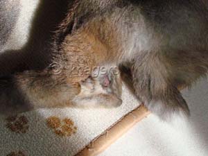 Op een dag (ergens midden juli) zag ik dat de vacht aan de binnenkant van haar rechterpoot erg dun geworden was. Dat vond ik al onrustwekkend.